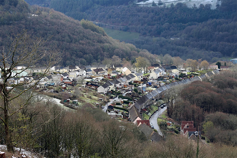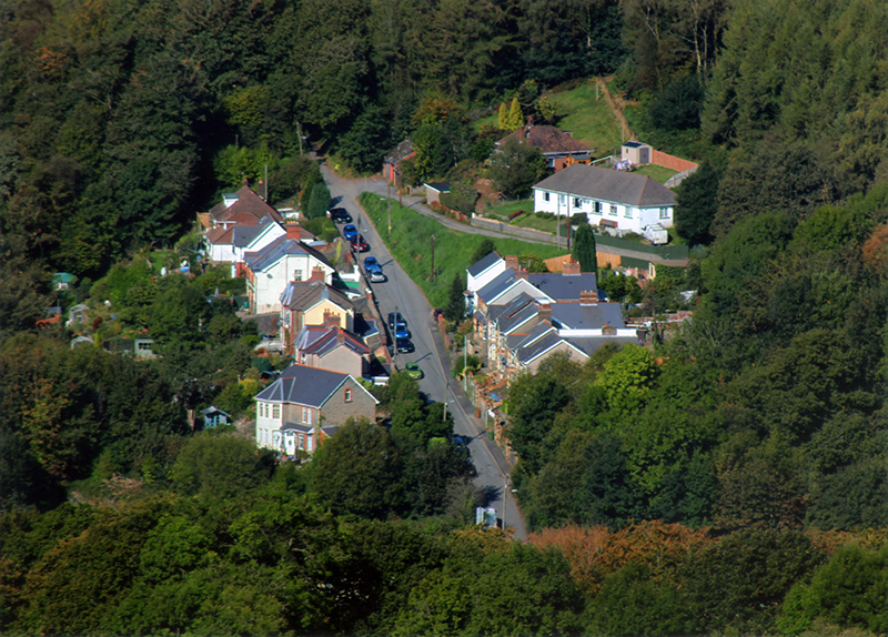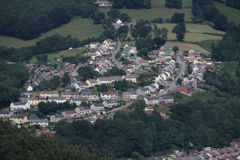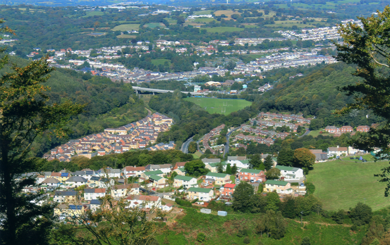 A modern panoramic view of Abercarn from the mountainside, stretching from West End at the extreme left, to the end of