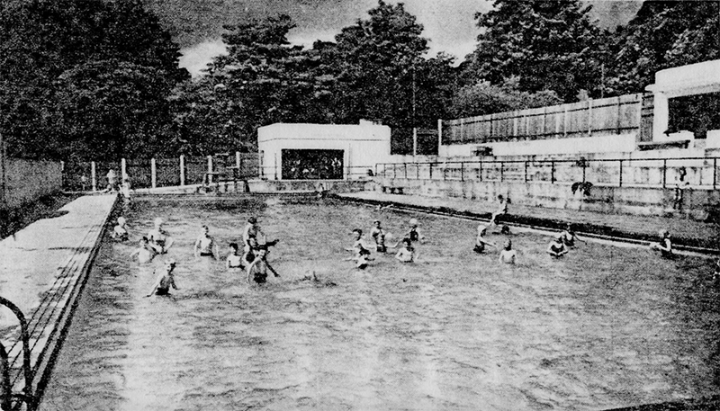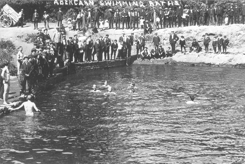 A photograph of kids playing in Abercarn Baths, taken from an official 'Abercarn Urban District Council' Guide, possibly from the 1940s. The guide was printed in Croydon, but all the photographs were supplied by the South Wales Argus. The view of the baths is taken with the photographer's back towards Abercarn, looking towards Newbridge.