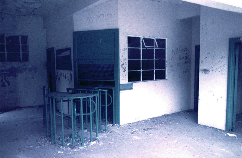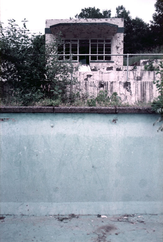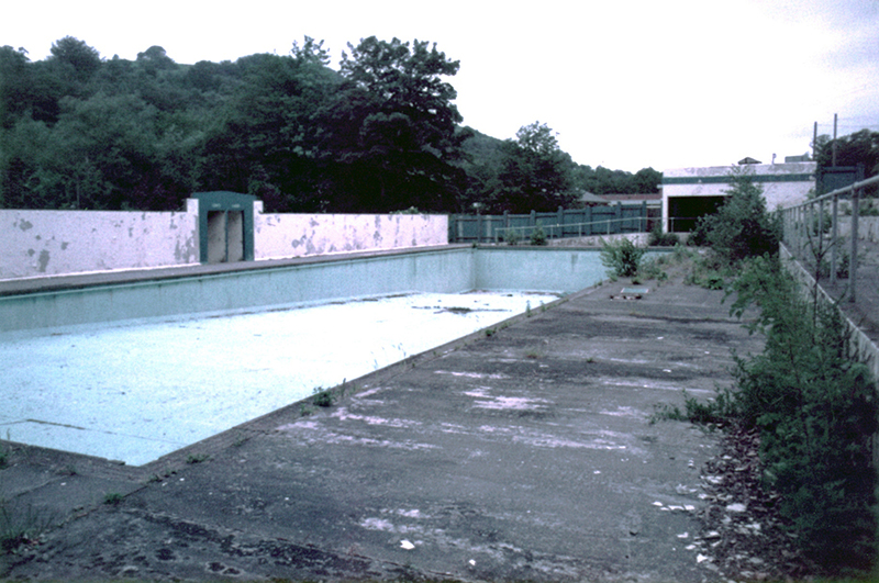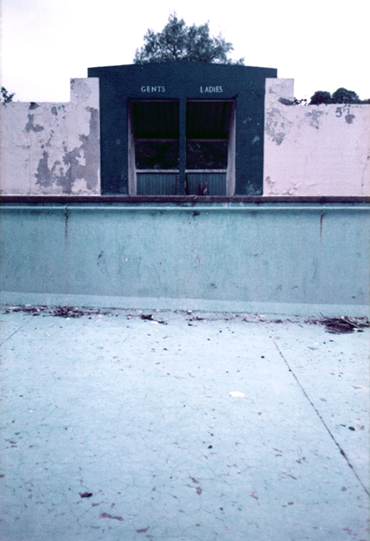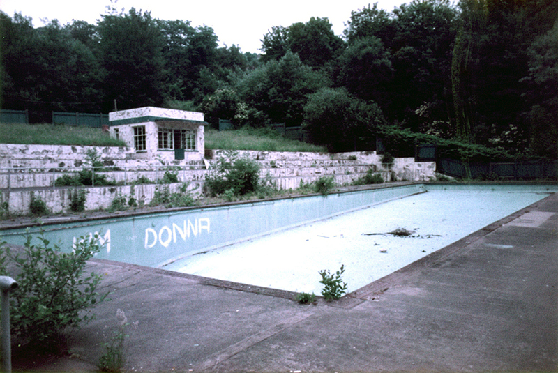 Photograph taken from in the empty pool, looking up at the derelict shop - these photographs were taken around 1985 © Dory Buck