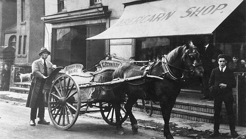 Milkmen John and Gilbert Davies with their horse and cart, delivering the milk in Crosskeys. Photograph courtesy of Wynne Rees