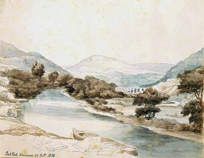 A third watercolour by Frances, Baroness Bunsen (1791-1876); this time looking back up the valley from the canal at Pontywaun, towards the lock at Factory Trip and Cwmcarn village. The artist has romanticized the view, making the canal and river much closer than they actually are. Dated October 1838.