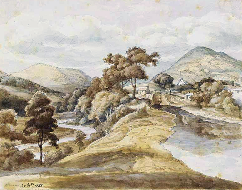 Another watercolour by Frances Waddington, older sister of Augusta Hall, Lady Llanover. This painting is dated October 1838 and looks down the valley towards Machen Mountain from the canal, somewhere near the present position of the bypass, adjacent to Cwmcarn High School.