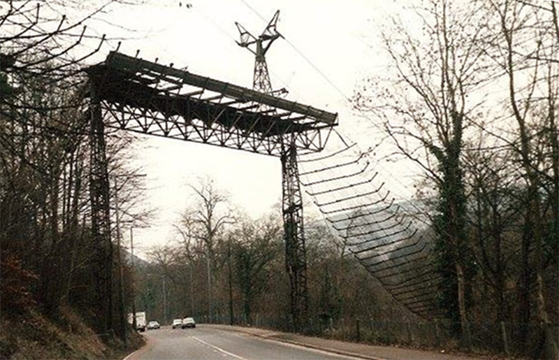 Looking over the roof top of the Garn Chapel toward Pantyresk Road; around 1985. The warning lights can be seen on Pantyresk level-crossing. © Ken Buck