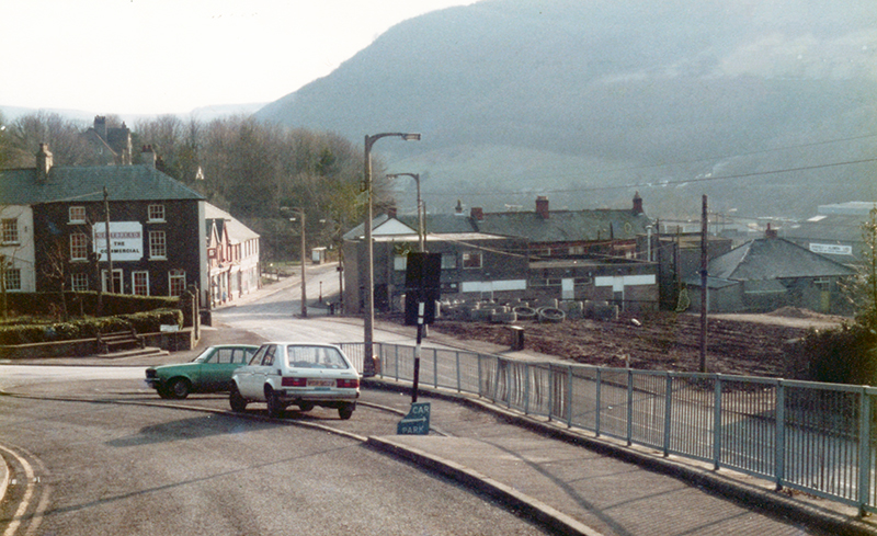 Looking down towards Abercarn, the Market and Commercial and the old Library from the hill up to Llanfach, photographed around 1978. © Ken Buck.