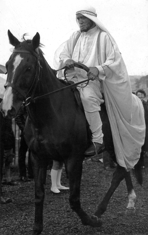 A photograph of film star Gregory Peck riding a horse, during the filming of 'Arabesque' in Crumlin during the summer (July) of 1965 with Sophia Loren. Taken on the railway embankment near Crumlin Viaduct and Treowen bottom park. © Robin Williams